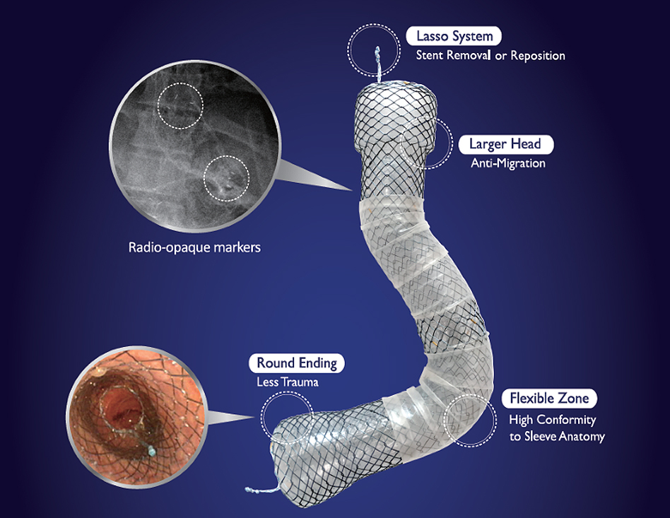 La malla sándwich de construcción multisegmentaria permite una completa flexibilidad y conformidad con la anatomía de la manga gástrica. El borde superior está ligeramente curvado hacia adentro, mientras que el borde inferior es completamente redondo para reducir el trauma en el esófago y el bulbo duodenal, respectivamente. El borde distal del stent Gastroseal está redondeado para reducir el traumatismo del bulbo o antro duodenal.